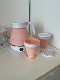 Vendo bollitore elettrico pieghevole in silicone, colore rosa con dettagli bianchi, perfetto per viaggi, campeggio o piccoli spazi.