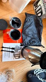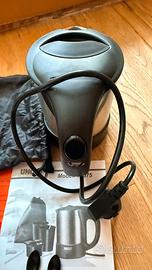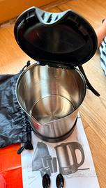 Bollitore da viaggio con 2 tazze plastica e zuccheriera e 2 cucchiaini. Per campeggio o casa piccola. Sempre decalcificato.