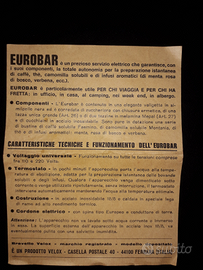Eurobar è contenuto in un elegante valigetta in similpelle, corredato di tazza, zuccheriera , cordone elettrico, propria scatola ed istruzioni per l'uso.