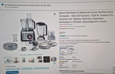 Vendo a 150, oggetto come nuovo comprato un anno fa ( 227 euro il prezzo attuale Amazon), consegna a mano a Milano in zona Stadera/Pezzotti caratteristiche prese dalla pagina Amazon: MOTORE EXTRA POTENTE: grazie ai 1250 watt che ti permettono di lavorare in modo facile e veloce grandi quantità di ingredienti e impasti lievitati impegnativi. CAPIENZA XXL: ciotola da 3,9 L e frullatore da 1,5 L ideali per grandi quantità. VELOCITA' REGOLABILE: la regolazione continua della velocità con indicazione LED ti garantisce risultati ottimali nel modo più semplice possibile. PRATICO E VERSATILE: scopri le più di 50 funzioni disponibili per affettare, macinare e frullare grazie agli accessori disponibili. DESIGN SALVASPAZIO: grazie alla capiente ciotola da 2,3 L puoi risparmare spazio riponendo gli accessori al suo interno. PULIZIA SEMPLICE: parti e accessori lavabili in lavastoviglie per risparmiare tempo prezioso. MADE IN EUROPE: prodotto progettato e prodotto negli stabilimenti europei secondo standard di altissima qualità. INCLUDE: nella confezione trovi il robot da cucina Bosch (nero), bicchiere frullatore, minitritatutto, spremiagrumi, gancio per impastare, un disco per patatine fritte, un disco grattugia/affetta, un disco per affettare spesso/fine, un supporto dischi, un pestello e un misuratore.