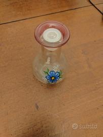 Splendida bottiglia in vetro trasparente, ideale come oliera o acetiera, caratterizzata da un elegante decoro floreale dipinto a mano (fiore blu con dettagli verdi e bianchi). La parte superiore presenta un bordo rifinito in vetro color rosa/amarena.