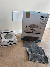 Braava jet m6 irobot con scatola, un panno originale per lavare a secco, un panno originale per lavare ad acqua e tre panni non originali per lavare ad acqua. Funzionante, ma a volte non si chiude bene lo sportellino in alto