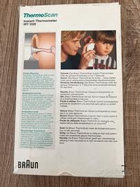 BraunThermoscan IRT1020. Consente la misurazione della temperatura corporea in un solo secondo attraverso l'orecchio. Funziona con una batteria alcalina da 9 volt (non inclusa). Dotato di custodia protettiva con alloggiamento per i coprilente (15 inclusi nella confezione) + libretto di istruzione.