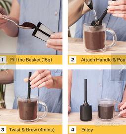 Permette di preparare il caffè fresco in modo semplice, basta aggiungere il caffè macinato nel cestello del filtro, e lasciarlo in infusione nella tazza con acqua calda per 5 minuti, dandogli una torsione e una mescolata all'inizio per aiutare l'estrazione del caffè. Adatto anche per infusione di tisane.