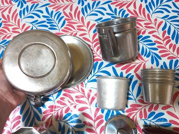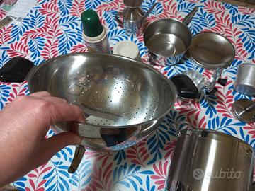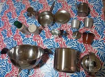 Articoli vintage cedo al pezzo. Prezzi: Oliera acciaio € 4 Porta vivande con cerniera acciaio € 10 Lattiera acciaio € 4 Bottiglietta e Bicchiere Termos € 10 Macchinetta caffè moka 2 tazze € 6 7 contenitori per budino alluminio € 7 Batticarne € 2 Coppetta terracotta € 2 Pentola a pressione piccola acciaio € 15 Scolapasta acciaio € 9