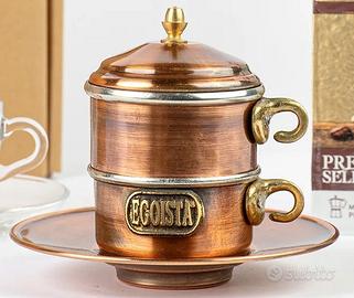 Confezione regalo composta da caffettiera napoletana "Egoista" in rame brunita, una tazzina in vetro, una presina ed una confezione di caffè macinato Gold 100% Arabica da 250 g