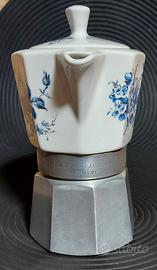 Caffettiera 3 tazze Flory Express originale, un vero pezzo da collezione Made in Italy risalente agli anni '70. La moka presenta la classica base ottagonale in alluminio e un bricco superiore in porcellana finemente decorata con un motivo floreale blu su sfondo bianco.