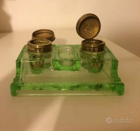 Calamaio vintage in cristallo, con coppie di boccette porta inchiostro coperchio in ottone,ottimo stato di conservazione Misura 16x11 cm.