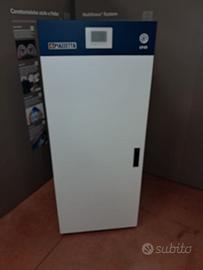 Caldaia Thermo a pellet con monoblocco, caldaia, focolare, braciere, convogliatore in acciaio. Sistema di pulizia dello scambiatore ad elementi rotanti. Vaso di espansione di serie, circolatore ad alta efficienza. Porta esterna reversibile, in acciaio, coibentata e apribile con maniglia.