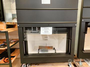 Caminetto a legna che si caratterizza per la larghezza della porta interamente in vetro ceramico con apertura a saliscendi e a ribalta per la pulizia. Camera di combustione rivestita in CMtech®, refrattario realizzato con spessori importanti; nella parte superiore il Catalizzatore-Frangifiamma è in CMtech®2, refrattario ceramico.