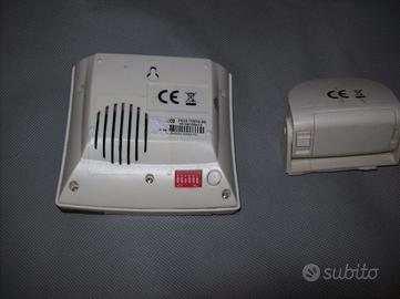 Per inutilizzo,vendesi campanello con sensore senza fili.Questo sistema è composto da un sensore ad infrarossi da installare accanto alla porta d'ingresso, alla finestra o in prossimità delle scale, e da un ricevitore di facile fissaggio a muro. Quando il sensore capta un movimento trasmette un impulso al ricevitore che attiverà un din don musicale .Trasmette sino a 20mt.Il sensore funziona mediante 3 batterie da 1,5V AAA (non incluse), mentre il ricevitore funziona con 3 batterie da 1,5V AA (non incluse).