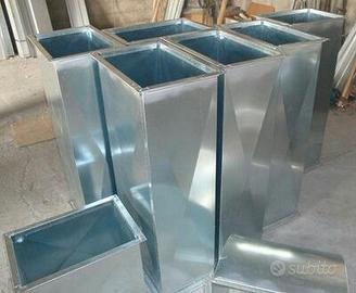 Canne fumarie o condutture nuove per cucine e ristoranti, 6 moduli da 2 metri l'uno a base rettangolare, 30x 15 cm, realizzati in lamiera zincata spessa 1 mm. e completi di comignolo antipioggia. Ideali per percorsi interni a case e locali, oppure all'esterno. Ritiro a mano.