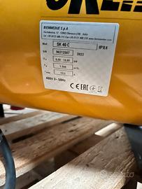 è un generatore di aria calda elettrico professionale/industriale, é alimentato con corrente elettrica a 400V. Infatti, in sostituzione del bruciatore ci sono delle resistenze elettriche che garantiscono il riscaldamento dell'aria convogliata mediante il ventilatore.
