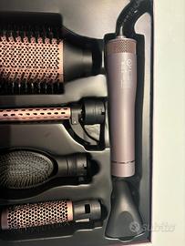 Accessori inclusi (6 in 1) 1.Concentratore Dry – pre‑asciugatura precisa 2.Spazzola Smooth & Delicate – districa e prepara 3.Spazzola ovale Volume & Straight – volume e lucentezza 4.Spazzola tonda Extra Wavy (32mm) – liscio morbido e punte modellate 5.Ferro arricciacapelli Curly (19mm) – ricci stretti e definiti 6.Custodia beauty bag – pratica per riporre gli accessori