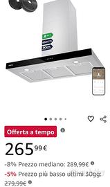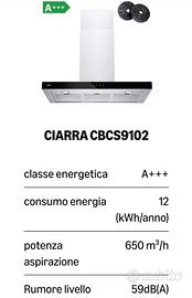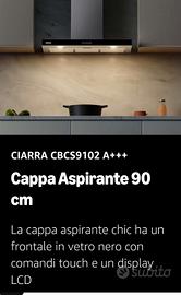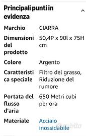NUOVA Cappa aspirante CIARRA CBCS9102 misura 90 cm color nero il frontalino, mentre acciaio la cappa, mai montata, acquistata x la mia casa al mare a 265 euro su Amazon (come da foto), ma x problemi di misure impossibilitato ad utilizzarla. Preferisco consegna a mano zona Lombardia (MI LC CO VA BG) visto la dimensione del pacco e la fragilità.