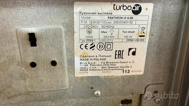 Vendo Cappa cucina Turboair pantheon ix/a/60, in acciao inox satinato, con vetro temperato.