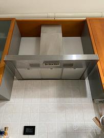 Cappa di aspirazione da 90 cm a vista. Design squadrato. Lampade led, filtri lavabili in lavastoviglie, uscita con tubazione. Tutto perfettamente funzionante. Qualche segno dovuto alla normale usura del tempo. Cambio per passaggio a cappa idonea a piano induzione.