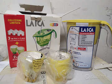 Caraffa filtrante della Laika nuova ancora nella sua confezione mai usata.La scatola contiene 1 caraffa filtrante 2 bicchieri colorati più 3 cartucce bi-flux ,ottima per chi è stanco di correre al supermercato per acquistare cassette di acqua, poco pratiche e molto ingombranti.
