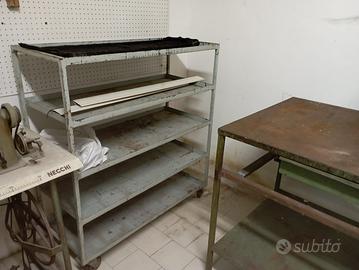 2 Carelli con ruote porta utensili e 2 tavoli di ferro da lavoro