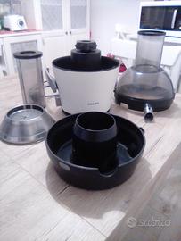 Centrifuga in acciaio inox. Beccuccio con sistema anti goccia per evitare la fuoriuscita di succo.Ampio canale per inserimento frutta e verdura. Doppio filtro. 2 velocità per ingredienti teneri o resistenti. Massima capacità estrattiva. Facilmente smontabile e con setaccio liscio rovesciato per renderla più facile da pulire e lavabile in lavastoviglie. Capacità l. 2,5 - Potenza max 900 watt.