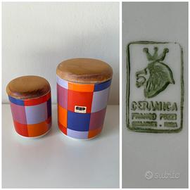 Coppia di vasi contenitori in ceramica Franco Pozzi Gallarate con il più bello e ricercato dei decori: quello a quadrotti colorati.