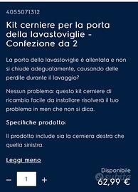 Vendo per doppio acquisto, cerniera originale rex elettrolux 4055071312 , di solito viene venduto il kit dx/sx 63 euro più spedizione avendo già comprato due kit ho una dx che mi avanza , singole vengono vendute più care del kit e non è semplice trovarle , io avevo trovato la sx originale e costava 36 euro più spedizione.