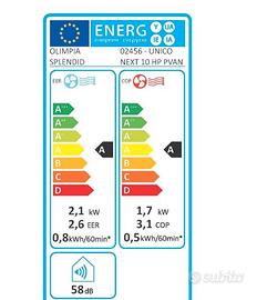 CLIMATIZZATORE A PARETE: Il climatizzatore a parete senza unità esterna Unico Next 10 HP PVAN garantisce un'efficiente distribuzione dell'aria e il massimo del comfort in tutte le stagioni RAFFRESCA, RISCALDA, DEUMIDIFICA: Climatizzatore senza unità esterna con potenza massima di 2,5 kW, offre raffrescamento, riscaldamento, deumidificazione e ventilazione, assicurando comfort tutto l'anno ALTA EFFICIENZA ENERGETICA: Utilizza gas refrigerante naturale R290, con GWP quasi prossimo allo zero, per raggiungere la classe energetica A e ridurre l'impatto ambientale SILENT MODE: Il compressore Twin Rotary e l’elettronica di ultima generazione, sincronizzati per un miglior comfort acustico, e la funzione Silent Mode, che riduce la rumorosità fino a 30 dB(A), garantiscono un ambiente silenzioso e confortevole MOLTEPLICI FUNZIONI: Economy: risparmio energetico, Auto: modula automaticamente il funzionamento in base alla temperatura dell'ambiente, Silent mode: modalità silenziosa, Timer 24h VALORE COMMERCIALE 1250,00 €uro