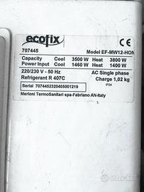 Vendo climatizzatore Ecofix 12000 BTU Inverter, completo di unità interna + motore esterno, perfettamente funzionante quando smontato. ✅ Funzione raffreddamento + riscaldamento (pompa di calore) 🔧 Specifiche: Potenza raffreddamento: 3500 W Potenza riscaldamento: 3800 W Alimentazione: 220/230V – 50Hz Gas refrigerante: R407C Modello: EF-MW12-HON 📦 Condizioni: Funzionante, da smontare