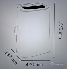 Climatizzatore portatile con pompa di calore, classe energetica A; 4 modalità: raffrescamento, riscaldamento, ventilazione, deumidificazione e 3 velocità di ventilazione.