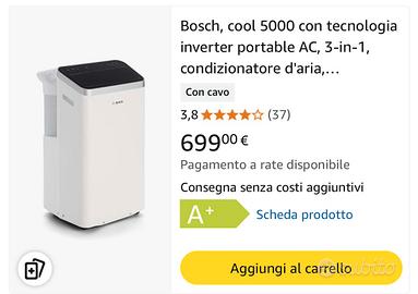 Bosch, cool 5000 con tecnologia inverter portable AC, 3-in-1, condizionatore d'aria, deumidificatore, ventilatore, 3,4 kW per ambienti fino a 46 m², con modalità automatica, silenziosa e sleep.