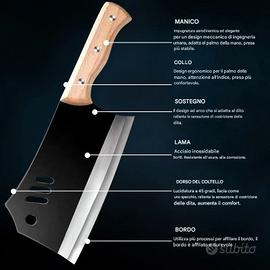 Materiale: lama in acciaio ad alto tenore di carbonio + manico in legno massello