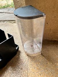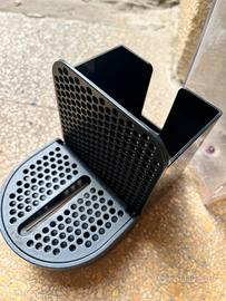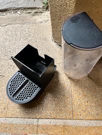 componenti di ricambio per macchine da caffè a capsule Nespresso, nello specifico per il modello Inissia. Contenitore capsule e poggia tazza: L'oggetto nero a sinistra è il gruppo che comprende il raccoglitore delle capsule usate e la griglia poggia tazza. È compatibile con i modelli De'Longhi e Krups Inissia. Serbatoio dell'acqua: L'oggetto trasparente a destra è il serbatoio per l'acqua con il relativo coperchio nero In ottime condizioni