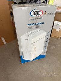 Condizionatore Argo con funzione deumidificatore - potenza 10000BTU. Provvisto di telecomando con batterie nuove, adattatori per tubo scarico aria calda e tubo per scarico condensa. Comprato a Giugno 2025 per sostituzione in emergenza e usato una settimana.