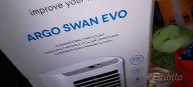 Vendo causa inutilizzo climatizzatore portatile ARGO SWAN EVO, acquistato al Mediaworld due anni fa. Utilizzato per circa 10 giorni, poi conservato a seguito di trasloco. Descrizione Climatizzatore portatile ARGO SWAN EVO. Classe energetica A. Potenza nominale raffreddamento 2,06 kW. Potenza frigorifero 8000 btu. Pannello comandi digitale con display a LED. Finitura bianco lucido. Telecomando multifunzione. Timer digitale di accensione e spegnimento programmabile (24h). Funzioni: raffrescamento, ventilazione e deumidificazione. Alette mandata aria orientabili in orizzontale e verticale. Funzione Sleep: comfort durante il sonno. Funzione Memory: auto-restart dopo un black-out, con mantenimento ultime impostazioni. Ventilatore a due velocità. Filtro dell'aria lavabile, facilmente rimovibile. Vaporizzazione automatica della condensa in funzione climatizzazione. Possibilità di scarico continuo condensa in modalità deumidificazione. Massima trasferibilità, grazie alle ruote multi direzionali e alle pratiche maniglie laterali. Tubo flessibile, adattatore per finestra e Kit per installazione fissa a vetro inclusi. Pressione sonora: min/max - 50/54. Refrigerante R290. Peso netto 21 kg. Dimensioni (HxLxP) 678 x 328 x 305 mm.