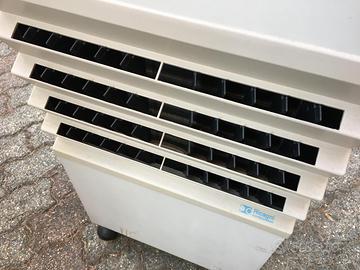 Condizionatore trasportabile, con rotelline, in buono stato , poco rumoroso, usato poco, con presa dell’aria tramite tubo flessibile, da posizionare nella fessura della finestra o da apposito buco sul vetro della finestra.