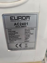 Condizionatore portatile Eurom AC2401 per Camper/Roulotte - Come nuovo condizionatore split portatile Eurom , la soluzione ideale per chi cerca fresco in camper, roulotte o piccoli ambienti senza dover fare installazioni fisse e costose. Il dispositivo è composto da due unità (interna ed esterna) collegate da un cavo piatto che permette di chiudere quasi completamente la finestra durante l'uso. Caratteristiche principali: Condizioni: Usato pochissimo, perfettamente funzionante e pulito. Facilità d'uso: Si appende alla finestra in pochi secondi grazie alle staffe regolabili. Efficienza: Raffredda velocemente piccoli spazi, molto silenzioso (ottimo per la notte). Compattezza: Occupa poco spazio quando riposto. Display digitale: Per impostare temperatura e timer. Perfetto per chi vuole godersi l'estate in viaggio senza soffrire il caldo. Preferito ritiro a mano ma posso spedire