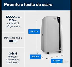 Capacità di raffreddamento 10.000 BTU, è ideale per stanze fino a 30 mq. Potenza 700W. Classe di efficienza energetica A++. Funziona con gas ecologico R290.