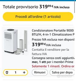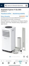 Causa trasferimento, vendo condizionatore portatile 9000 btu acquistato su Amazon a l'11 giugno 2025 per € 320, e ancora in garanzia (24 mesi), utilizzato pochissimo (non più di 30 ore di funzionamento). Si tratta del Condizionatore Portatile 9000 BTU/H della Homesixt, 4-in-1 Climatizzatore Portatile, Ventilatore, Deumidificazione, ventilazione mit Doppio Display Digitale, 24H Timer, Modalità Sleep, Applicabile a 88m³(33㎡). Ottimo prodotto (recensioni Amazon 4 stelle).
