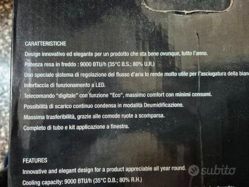 Condizionatore portatile perfettamente funzionante ( e esteticamente perfetto), usato pochissime volte. Lo vendo per inutilizzo. Dotato di funzione raffreddamento e deumidificatore. Facile da installare: è sufficiente collegare il tubo di scarico e posizionarlo verso l’esterno. Ideale per rinfrescare ambienti senza installazioni fisse. specifiche: Capacità di deumidificazione (l/h): 1.7 Capacità di raffreddamento in watt (max) (W): 2400 Emissione acustica (dBi): 60 Capacità di raffreddamento (max) (BTU/h): 9000 Classe: A Incluso: libero di istruzzioni, telecomando originale, tubo di scarico. --- Ritiro a carico dell'acquirente---