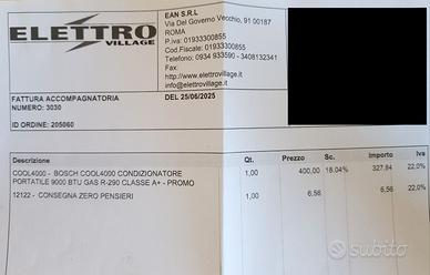 Vendo per cessato bisogno condizionatore portatile Bosch cool 4000 3 in 1 (condizionatore d'aria, deumidificatore, ventilatore, 2,6 kW per ambienti fino a 35m², con modalità automatica, silenziosa e sleep) acquistato il 25/06/2025 come da fattura in foto, con sole 10 ore di funzionamento. Dimensioni del prodotto 46P x 40l x 80H cm - Valutazione BEE 5 stelle.