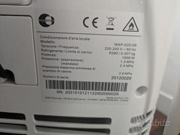 Condizionatore portatile marca Equation modello WAP-02EI26. Funziona come raffreddamento, deumidificazione e ventilazione (con ventola di velocità regolabile e temperatura regolabile. Classe energetica A. Comprato nuovo da Leroy Merlin. Perfettamente funzionante con tubo dell'aria estensibile da attaccare alla finestra, non trovo più il telecomando ma si utilizza dal pannello dei comandi Solo ritiro a mano a Lissone oppure consegna nelle zone limitrofe.