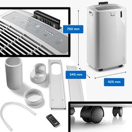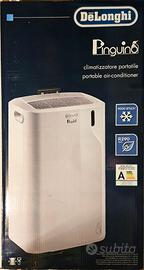 Vendo condizionatore portatile De’Longhi Pinguino modello PAC EM77 (valore 599€). Condizioni ottime, usato pochissime volte. Lo vendo causa passaggio a condizionatore fisso. Provvisto dell'imballo originale e di tutti gli accessori originali (tubi, adattatori, telecomando, manuale...). ✓ Potenza di raffreddamento: 9.000 BTU (stanze di 30 m²); ✓ Deumidificatore molto efficace: oltre 6 litri di acqua in una sola notte estiva; ✓ Pratico da spostare grazie alle rotelle; ✓ Telecomando incluso; EXTRA: regalo telo termoisolante per grandi infissi (altezza oltre 1,5 m), che ho acquistato a parte. Disponibile per prova e ritiro a mano.