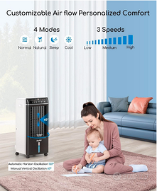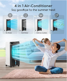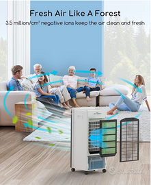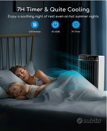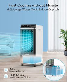 Vendo condizionatore portatile, marca IcyAir, 4 in 1: raffreddatore d’aria a vapore, purificatore d’aria, umidificatore, ventilatore a 3 modalità, 3 velocità, timer 7 ore, telecomando, serbatoio 4,5 lt, 550 mc/h, filtro antipolvere, dimensioni cm 28x65x24, livello rumore 45 dB, peso 5,5 kg, potenza 65 watt, oscillazione verticale di 60°, orizzontale di 120°, pannello di controllo a LED, con 4 mattonelle di ghiaccio sintetico, classe di efficienza energetica A+, con rotelle e maniglie per spostarlo facilmente, per casa o ufficio.