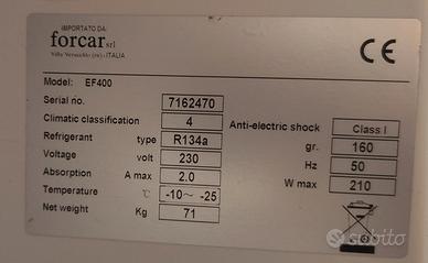 Congelatore a colonna marca FORCAR EF400, temperatura -10°/-25°, dimensioni cm L 60 X P 58,5 X H 185,5, capacità 400 lt, peso 71 kg, 6 ripiani fissi 480 x 440 x h 160 mm.