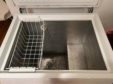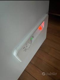 Ho questo congelatore in vendita. Funziona ma la temperatura non scende molto, è tra un frigorifero e un congelatore, forse, ma può congelare un po'. Ecco perché si accende la luce rossa. Inoltre il cavo ha un piccolo taglio che ho riparato con del nastro adesivo.