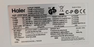 Haier H2F-255FSAA. Capacità netta congelatore: 262 L, Classe efficienza energetica: E, Classe climatica: SN-T, Capacità di congelamento: 20 kg/24h, Autonomia senza energia elettrica: 14 h, Emissione acustica: 40 dB, Sistema No-frost. Cerniera porta: Destra. Tipo di lampada: LED. Consumo energetico annuo: 248 kWh. Colore del prodotto: Acciaio inossidabile