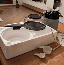 Completa di accessori: ciotola da portata, divisore pastella, misurino