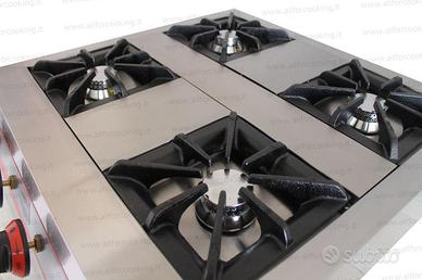 Struttura in acciaio inox, bruciatori in alluminio. Dotato di quattro griglie poggia pentola singole in ghisa. L'intensità della fiamma è regolabile grazie alle manopole posizionate frontalmente. La distanza tra i bruciatori permette di utilizzare pentole di elevato diametro.