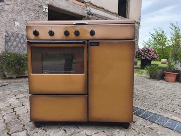 vano portabombola a gas, quattro fornelli su superficie di 80 cm x 40 cm. Forno con tre ripiani, regolabili, con fornello lungo e rettangolare.