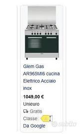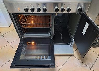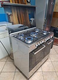 vendo come da foto una bellissima e nuovissima cucina a gas GLEM 5 fuochi in acciaio inox forno elettrico ventilato con porta bombola classe A modello AR965MI6 in ottime condizioni, perfettamente funzionante, pari al nuovo, accensione elettrica, stop gas, misura L90P60H94,